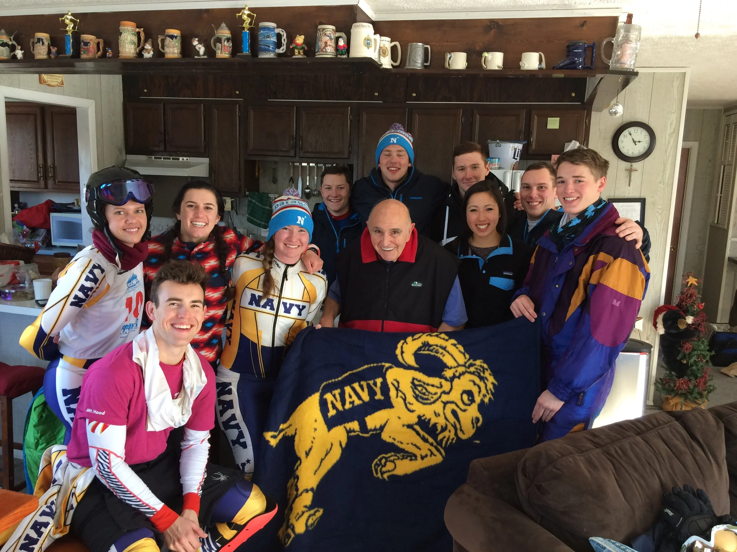 USNA Class Of “58 grad, Ralph Carestia is visited by the USNA Ski Team